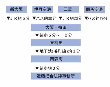| 地下鉄堺筋線・谷町線「南森町」駅(JR東西線「大阪天満宮」駅)の1番出口を右へ(西方向、西天満交差点方面へ)150m歩いて頂き、1階にモスバーガーのはいっている赤煉瓦ビルにおはいりください。6階でお待ちしております。 |